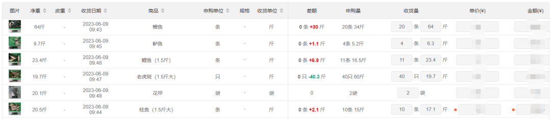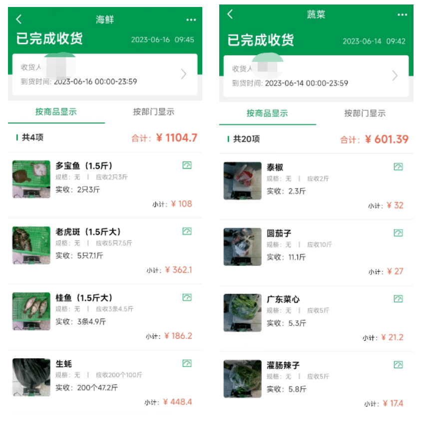 通过后台,可以清楚地看到是谁下的单、下了多少、哪个供应商送的货、谁收的货,收了多少货,收货时的照片都一清二楚。而且数据自动统计,哪个商品收多了,那个商品收少了,收多了多少,收少了多少,都能够很直观地展现出来,非常得透明化。