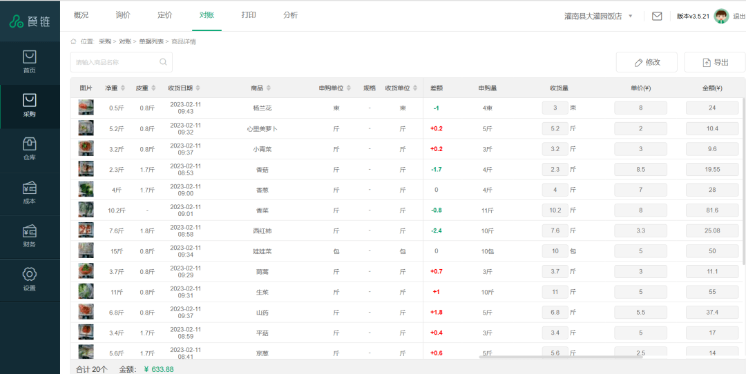 就像对账工作,此前大灌园都是通过纸质单进行对账,财务每次都要拿着一大叠纸质单,将账单中的内容一项一项录进excel表格,仔细检查商品名称、核对数量、填上单价,再要核算总价。