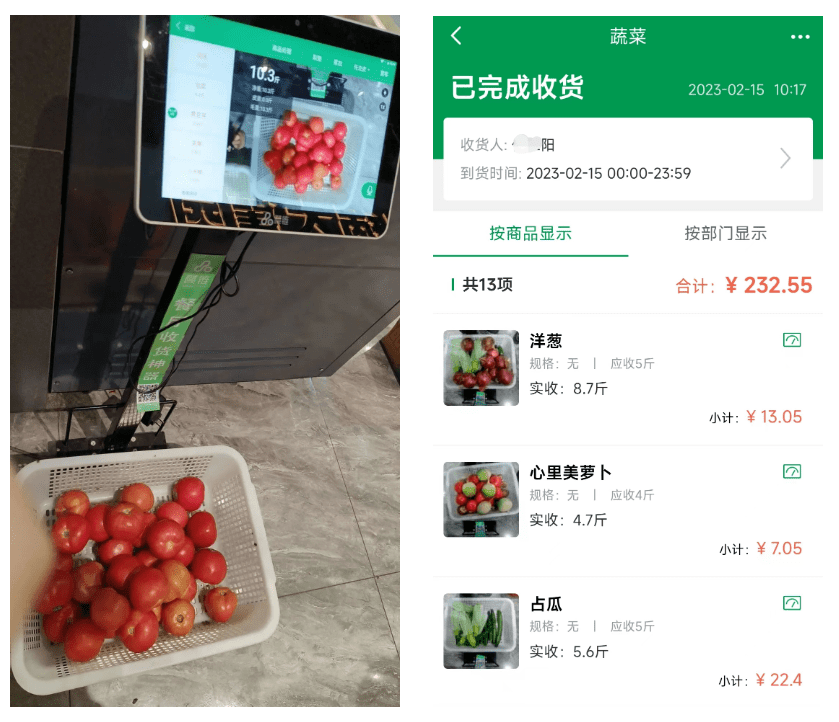 另外,所有食材上秤前,都要拆袋入框检查质量,再上秤拍照,确认收货后,收货人、送货人、收货数量、图片等数据自动上传系统后台,不可人为修改。