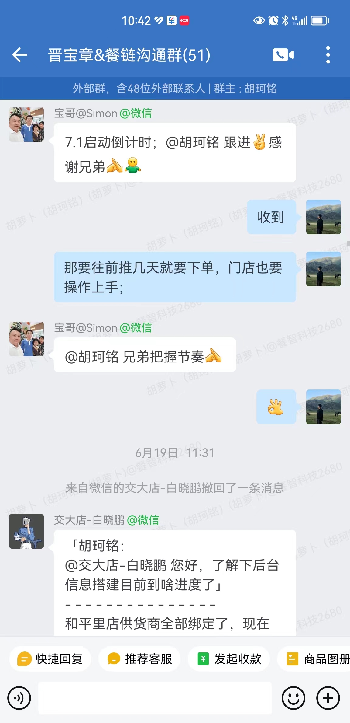 对此,宝哥身先士卒,亲自带领员工一起学习如何使用餐链。在餐链沟通群里,咱们的实施老师会一步一步地帮助晋宝章的员工解决问题,宝哥也化身监督员时时关注员工的学习使用情况,如果发现有人因为主观原因不积极认真地执行,宝哥也会直截了当地指出来。