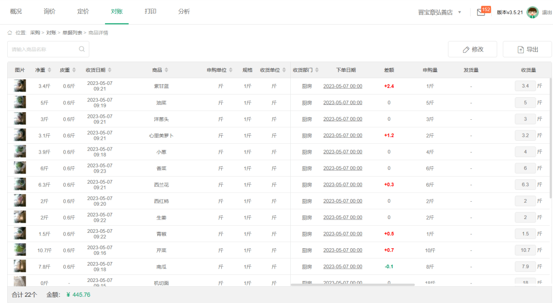 √ 采购每个节点都会有数据留存,且信息同步,比如收货时,智能电子秤会同时显示订货数量与实收数量,多收少收一目了然。