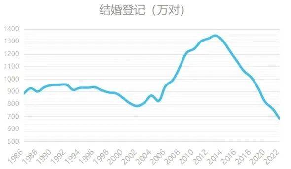 可遗憾的是,适婚人群却越来越少。2022年我国结婚人数为683.3万对,这是自2013年以来连续第9年下降,创下了1986年以来数据新低。