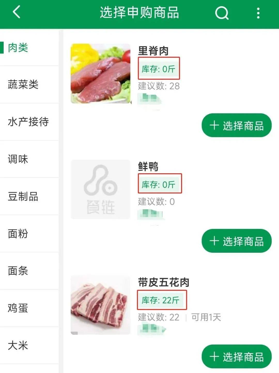 厨房用餐链采购管家申购,由于系统打通了厨房和仓库两个部门的信息通路,厨房申购时可看到食材的实时库存,结合库合理采买,保证下单数量的标准。