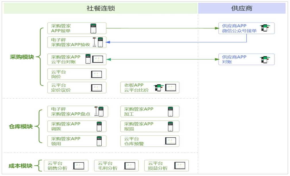 在明确目标后,北园香经过多轮产品调研、筛选,最终选择了智能化供应链管理系统——餐链进行合作。餐链提供采购管理、仓库管理、成本精细化管理等一站式解决方案,助力北园香降本增效。