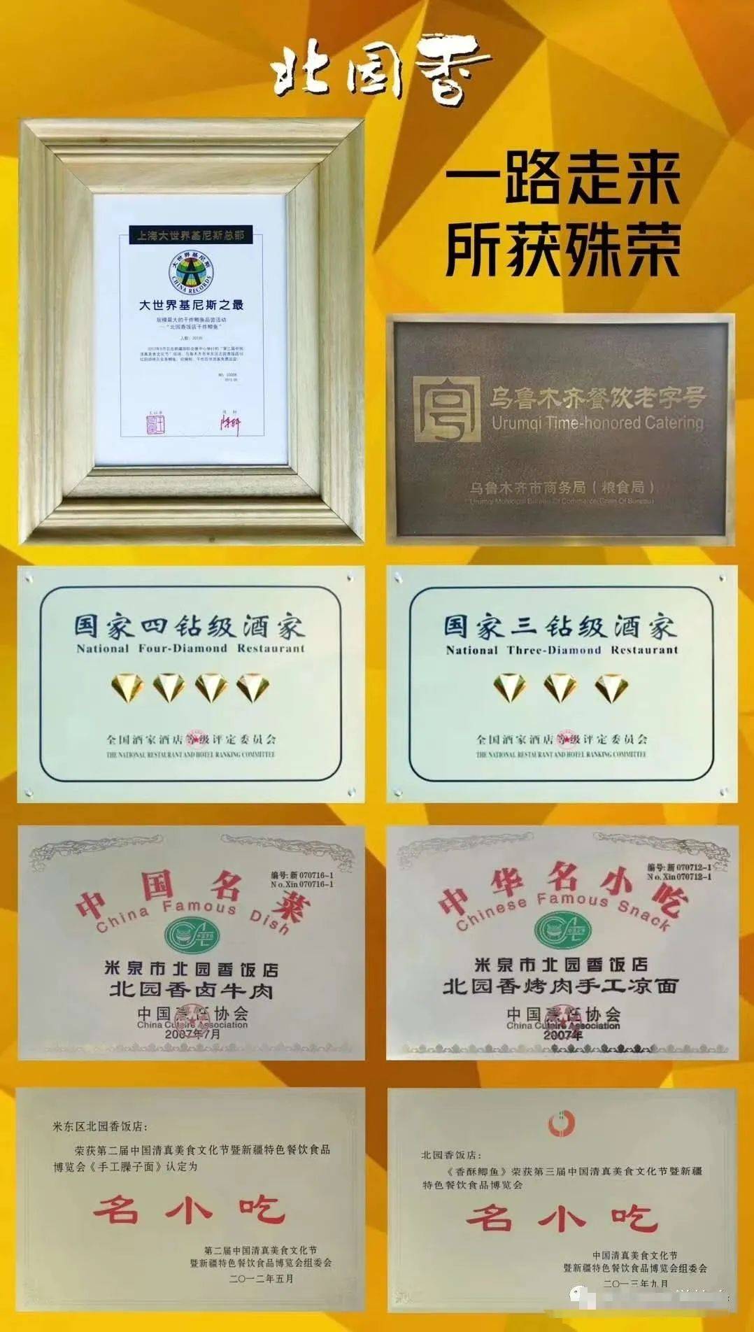 34年来,北园香从一家只有5张桌子的小店,发展到现在拥有2家饭店,总面积达6700平方米的“餐饮老字号”。期间获得了大大小小各项荣誉:2014年被评为国家四钻级酒家酒店,同时,被评为乌鲁木齐“老字号”餐饮,2015年被评为“国家酒家酒店示范店”。