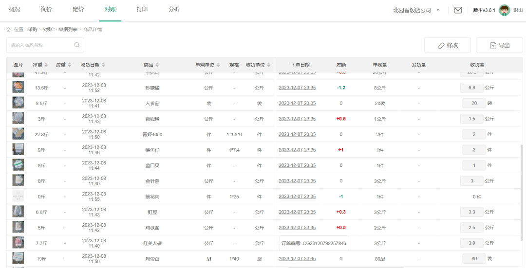现在用餐链对账,录单这个工作已经完全砍掉了。供应商将货送来,饭店把所有食材用餐链智能电子秤进行称重拍照,应收多少、实收多少、超收少收多少,电子秤都会自动记录,收货完成后,所有数据自动上传后台,生成账单。并且,商品在定价后,单价自动回填,系统自动核算金额,几乎不会漏单出错。