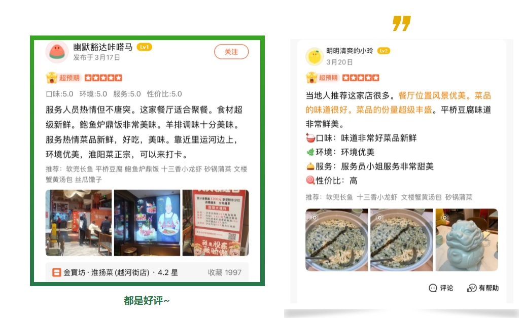 金宝坊不仅有传承经典的菜品(如清炖蟹粉狮子头、文思豆腐等),同时还有融入创新的新式菜肴,符合现代年轻群体对健康与美味的双重需求。多年来,金宝坊以其地道的淮扬菜品和新鲜的食材吸引了无数回头客,深得消费者的好评。