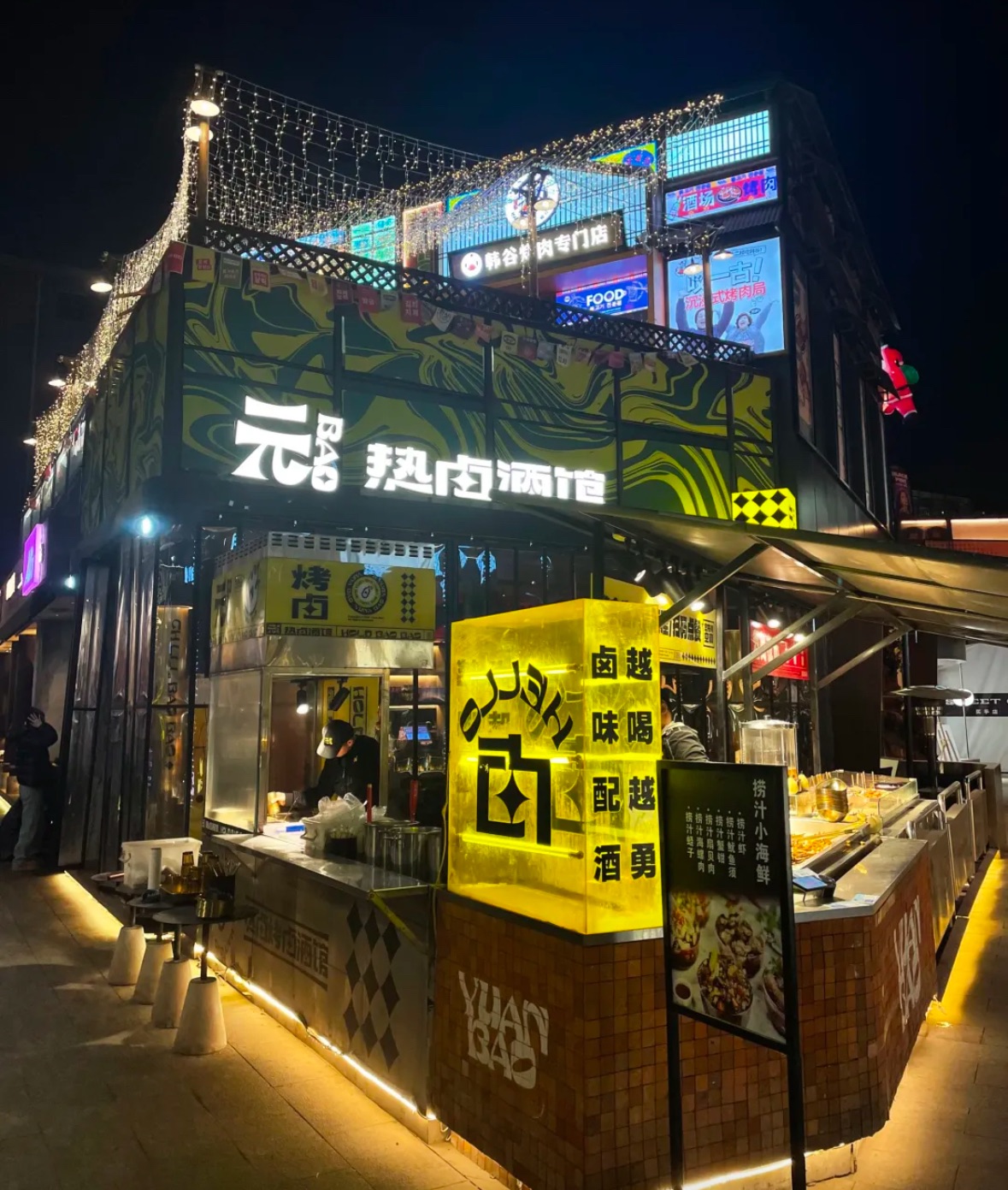 在西安这座既承载着千年古韵、又跃动着现代活力的城市里,有一家名为“元Bao热卤酒馆”的门店以其独特的风格,重新为消费者诠释了什么叫做传统与潮流的碰撞。走进店内,重金属工业风与户外露营元素的混搭设计瞬间抓住眼球——粗犷的金属框架、暖调的露营灯饰,与热气腾腾的卤味档口形成鲜明对比,既硬核又充满烟火气。