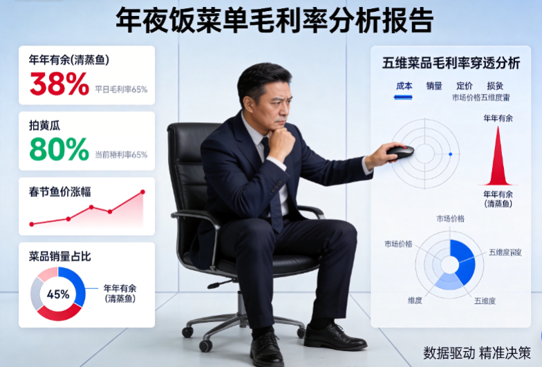 ● 按菜品反推采购:这是最核心的价值——五维分析告诉我们“清蒸鱼毛利低但必须保留”,那么系统会根据这道菜的预估销量,结合到货间隔,自动拆解出精准的采购需求:除夕当天需要多少条活鱼?初三之前需要备足多少冻品作为储备?