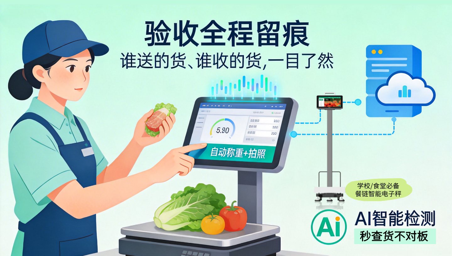 以智能硬件+AI技术筑牢验收防线,智能电子秤自动称重、实时拍照,数据实时上传不可篡改,从根源杜绝人为作弊;AI图像识别秒级核验食材与订单一致性。
